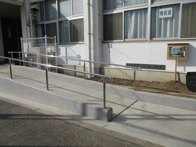 職員玄関横のスロープが完成しました。昭和52年度卒業制作「朝日東小学校歌碑」は撤去となりましたが、その跡を示す看板を設置しました。また、ブドウ棚は南陽園様のご協力により中庭に移植しました。また実をつけるのを楽しみにしています。